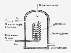 The second example involves modelling the heating of water in a hot-water storage tank. The figure below shows systematically an 'indirect' domestic hot-water tank. In this design of hot-water system the central heating boiler, or other primary source of heat, supplies hot water to a calorifier (which takes the form of a coiled pipe) inside the hot-water storage tank. The main mass of water in the tank is then heated by the hot water passing through the calorifier coil. We wish to calculate how quickly the hot water in the tank will heat up.