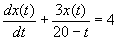 Suppose that a tank initially contains 80 liters of pure water. At a given instant (taken to be t = 0) a salt solution containing 0.5 kg of salt per liters flows into the tank at the rate of 8 liters min-1. The liquid in the tank is kept homogeneous by constant stirring. Also, at time t = 0 liquid is allowed to flow out from the tank at the rate of 12 liters min-1. Show that the amount of salt x(t) (in kg) in the tank at time t (min)