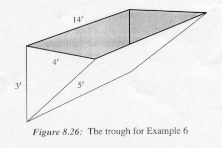 A trough 14 feet long has one rectangular vertical side 14 feet by 3 feet, one rectangular inclined side 14 feet by 5 feet, and two triangular ends with sides 3 feet, 4 feet, and 5 feet (See Figure 8.26). If the trough is filled to the top with water, compute the force on each end and each side.